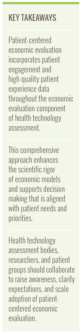 Defining a few key terms will provide a foundation for this discussion. Patient engagement in research is defined as “active, meaningful, and collaborative interaction between patients and researchers across all stages of the research process.”1 Patient experience data (PED) are “intended to provide information about patients’ experiences with a disease or condition,” including “the impact of such disease or condition, or a related therapy, on patients’ lives… [and] patient preferences with respect to treatment of such disease or condition.’’2 Patient-centered economic evaluation is conducted through the engagement of patients as research partners and the application of high-quality PED throughout HTA processes.