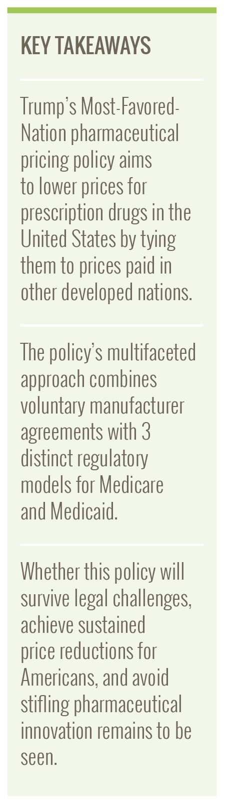 President Donald Trump’s Most-Favored-Nation (MFN) pharmaceutical pricing policy represents one of the most audacious federal initiatives to address prescription drug costs in American history. The policy has evolved into a multifaceted approach combining voluntary manufacturer agreements with 3 distinct regulatory models: GENEROUS for Medicaid, GLOBE for Medicare Part B, and GUARD for Medicare Part D. Together, these agreements and models are part of a strategy to fundamentally reset the prices that Americans pay for prescription medications by tying domestic prices to those paid in other developed nations.