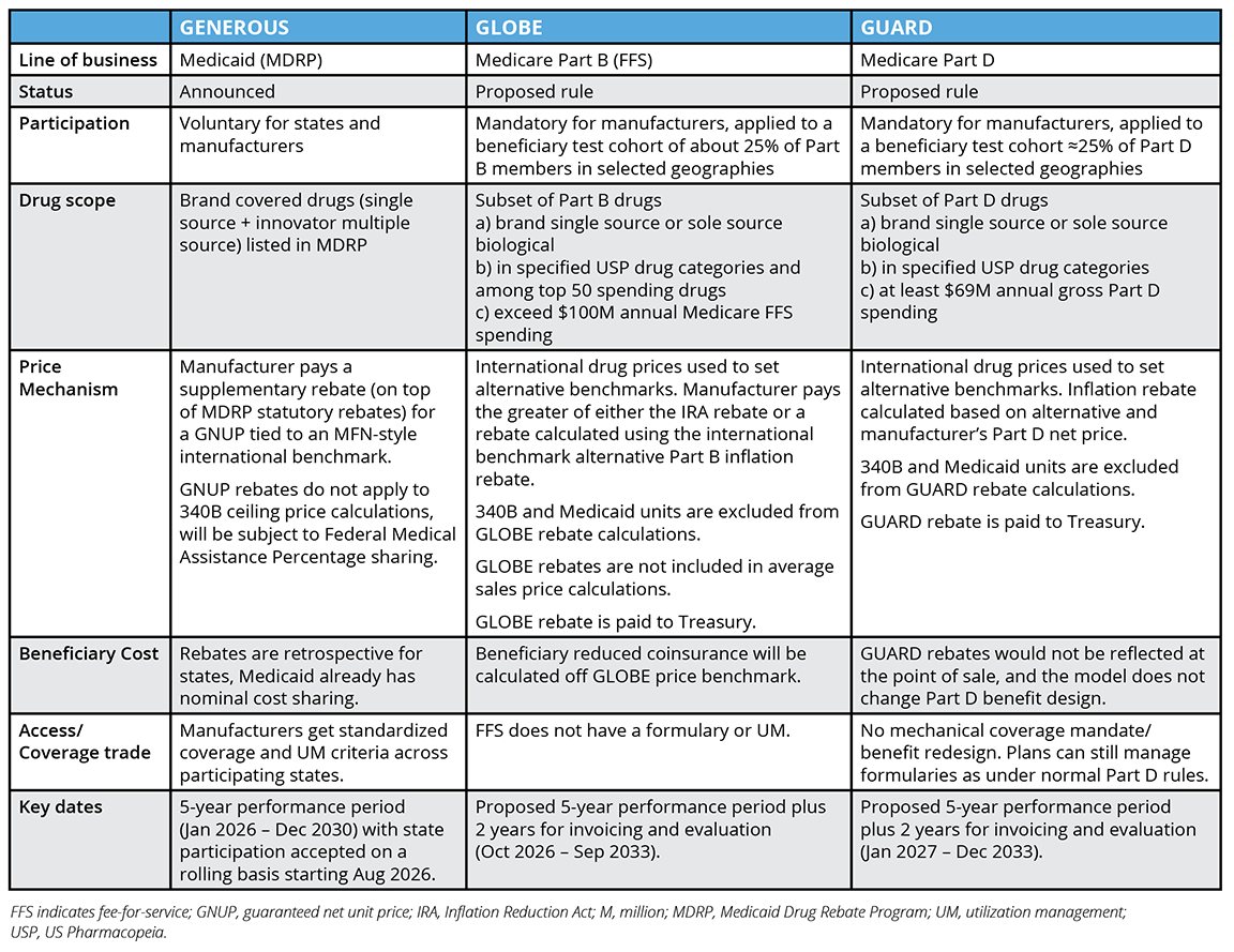 Below, we present the key characteristics, impacted pharmaceutical benefits, and timelines for the 3 MFN models. We further summarize the details in the Table.